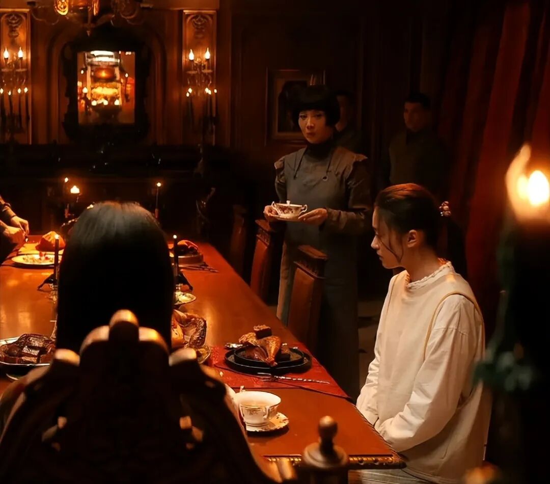 当她看到养女不吃东西时,低头微微一笑,然后用叉子弄起一块非常油腻的红烧肉放到养女盘子里。