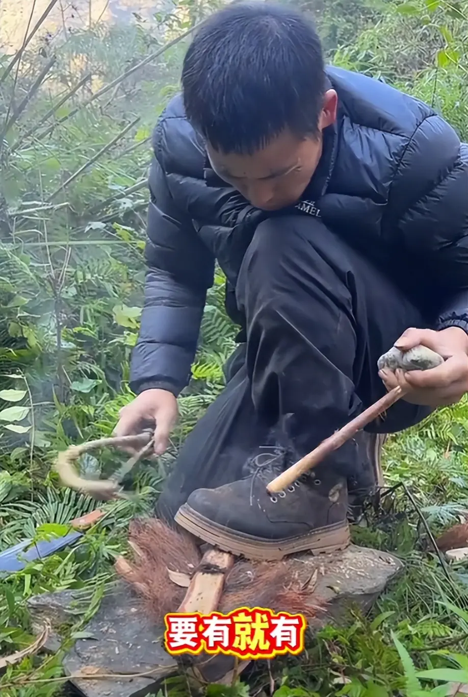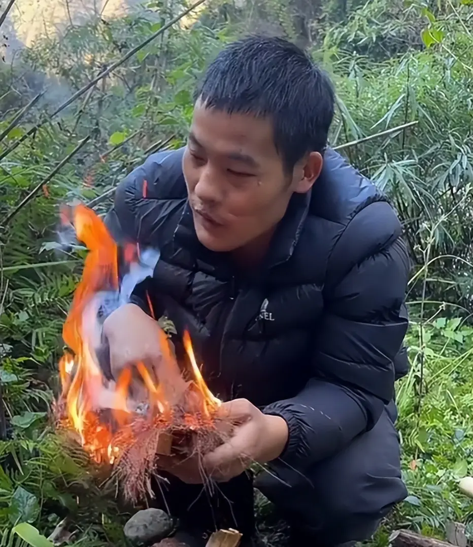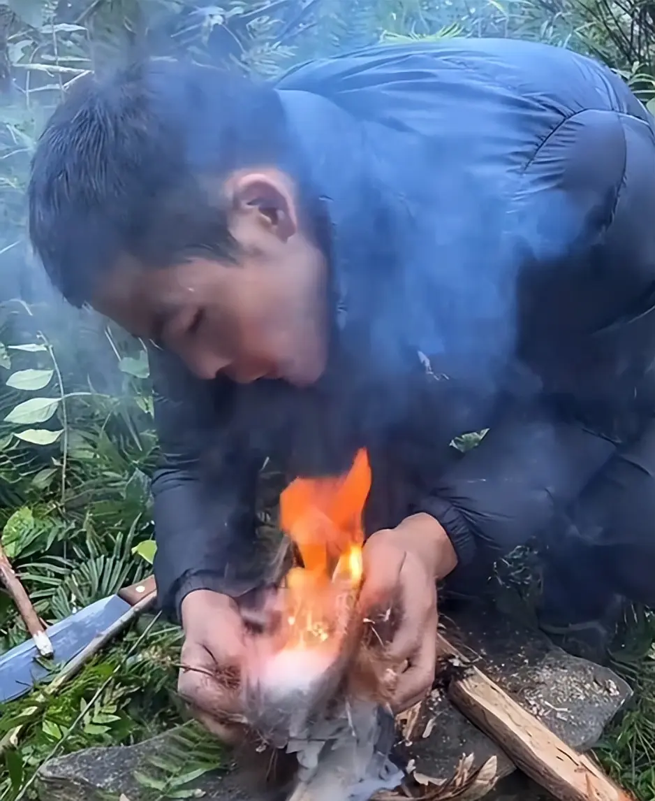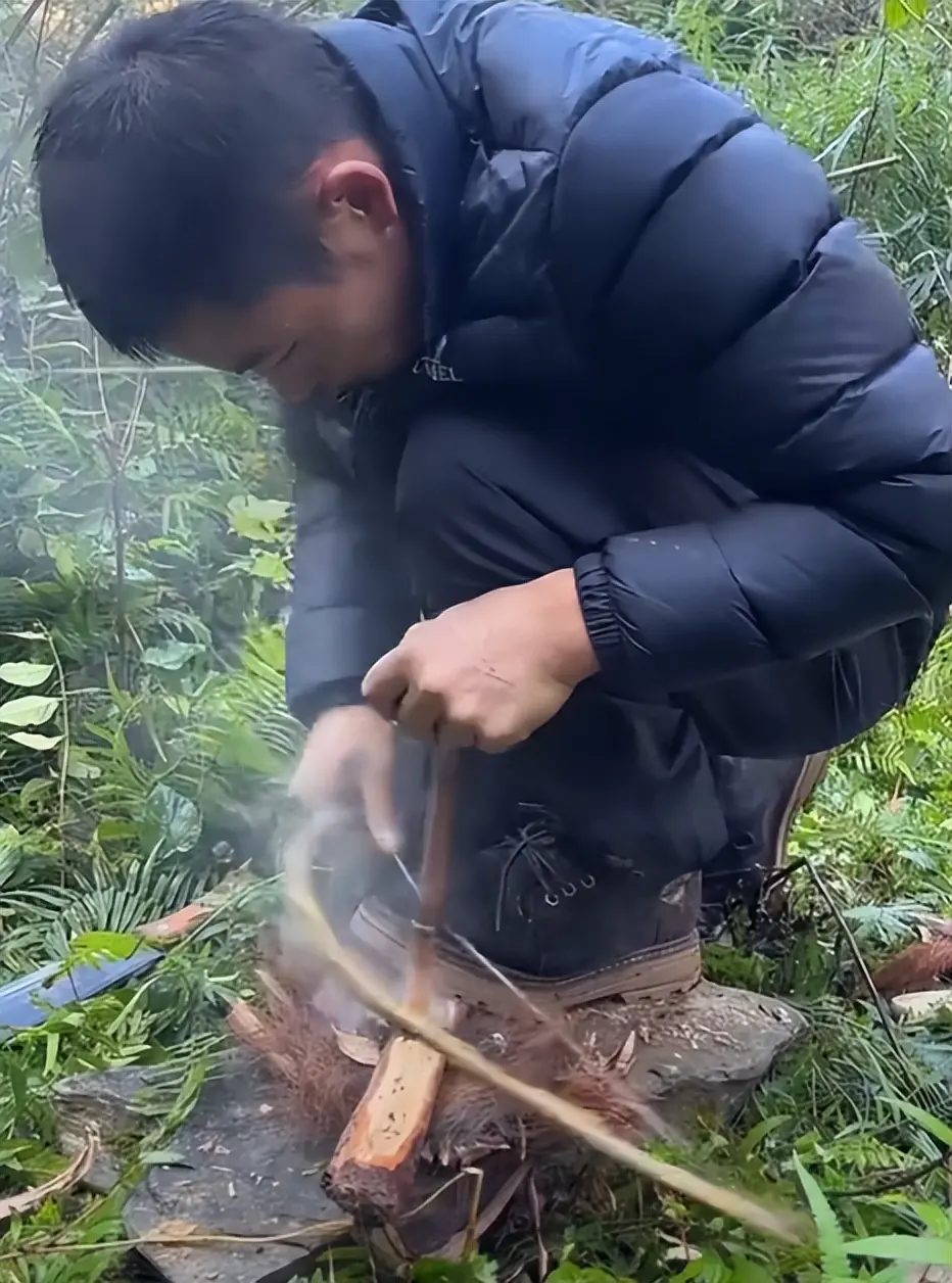 在木头的下方,刀疤哥将木绒揉碎成絮状放在了下面,等到木炭起烟之后,木绒在高温的作用下成功起火。